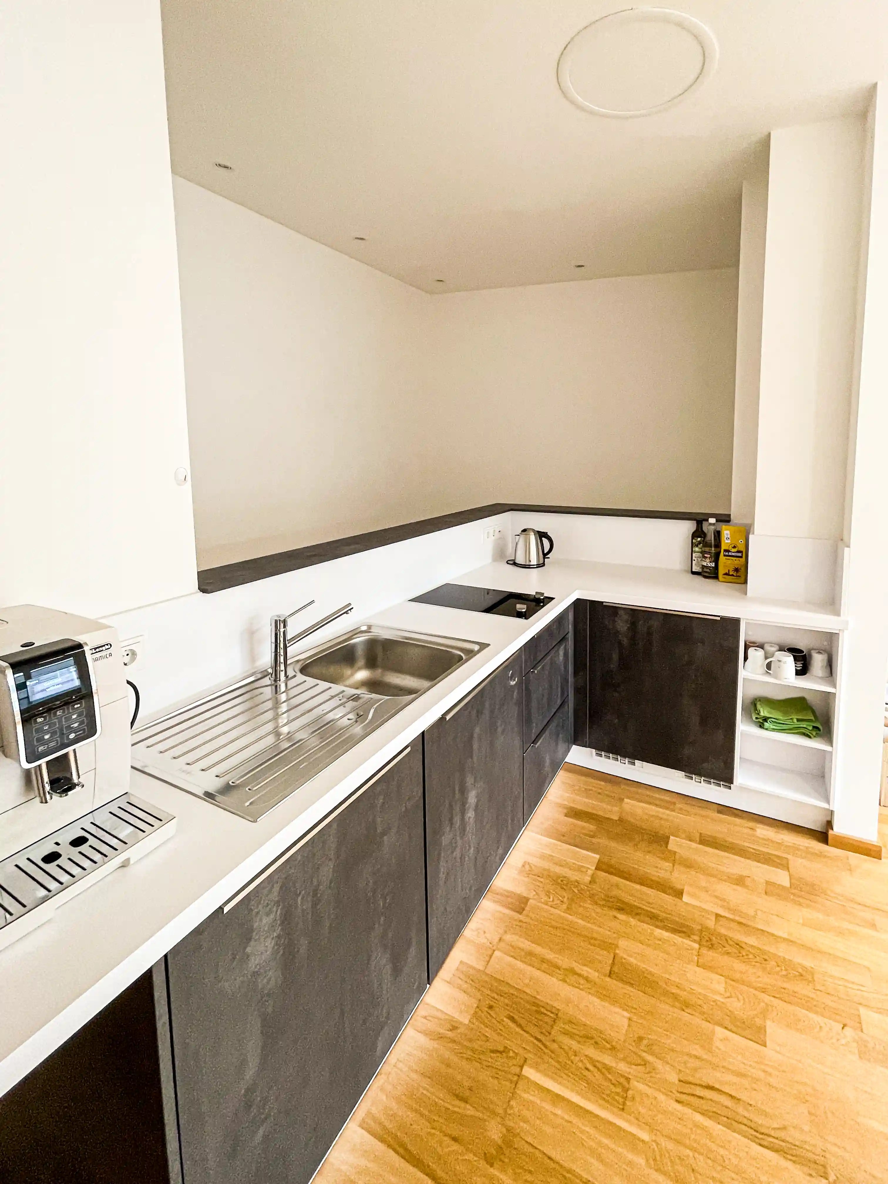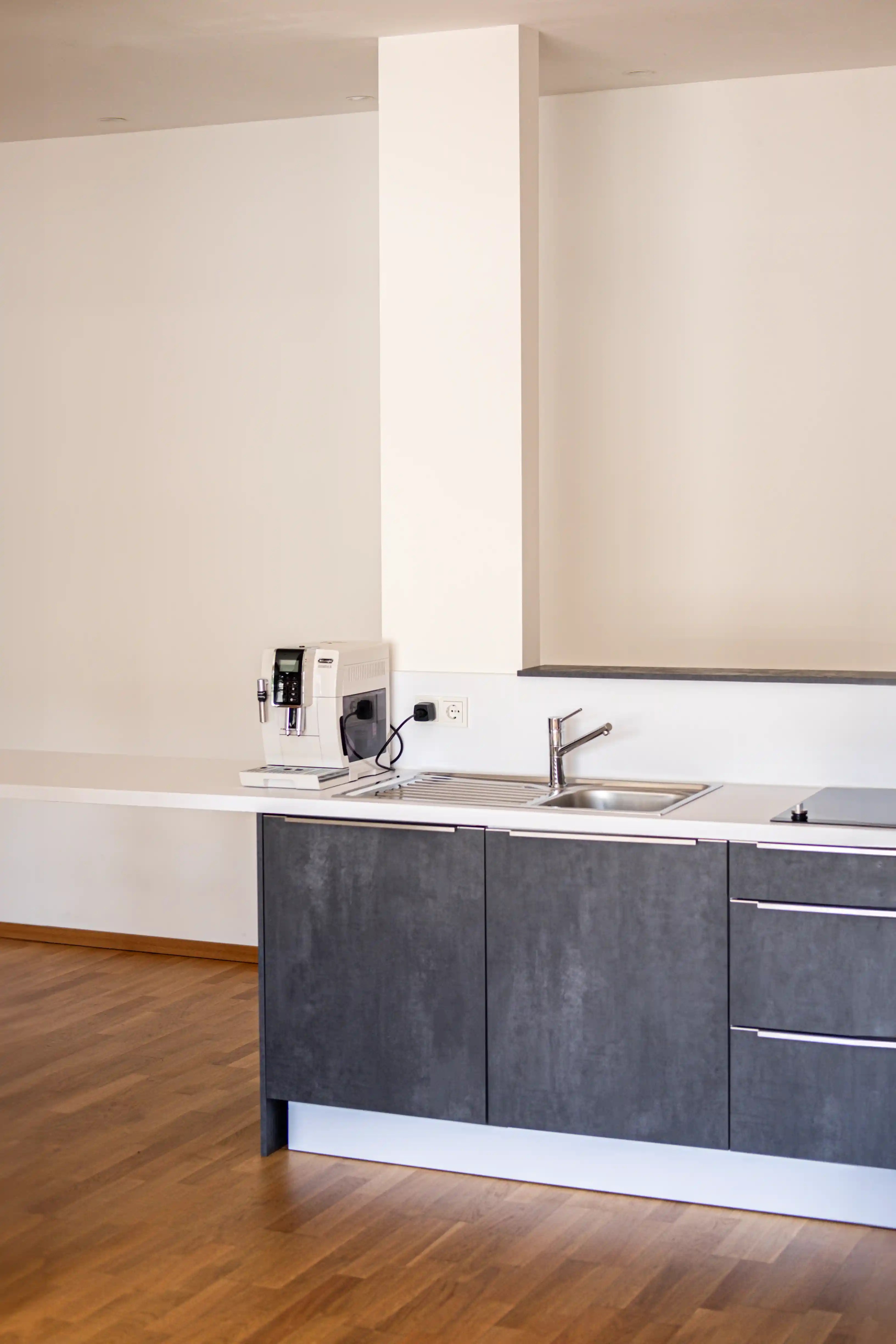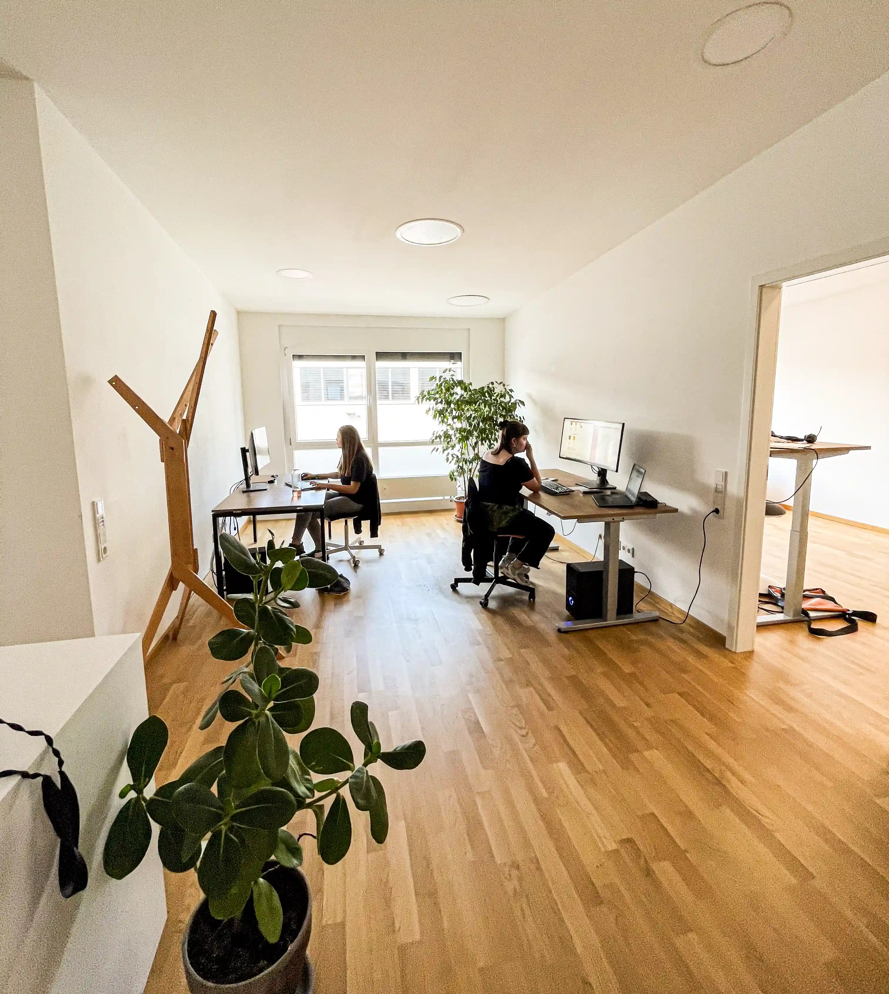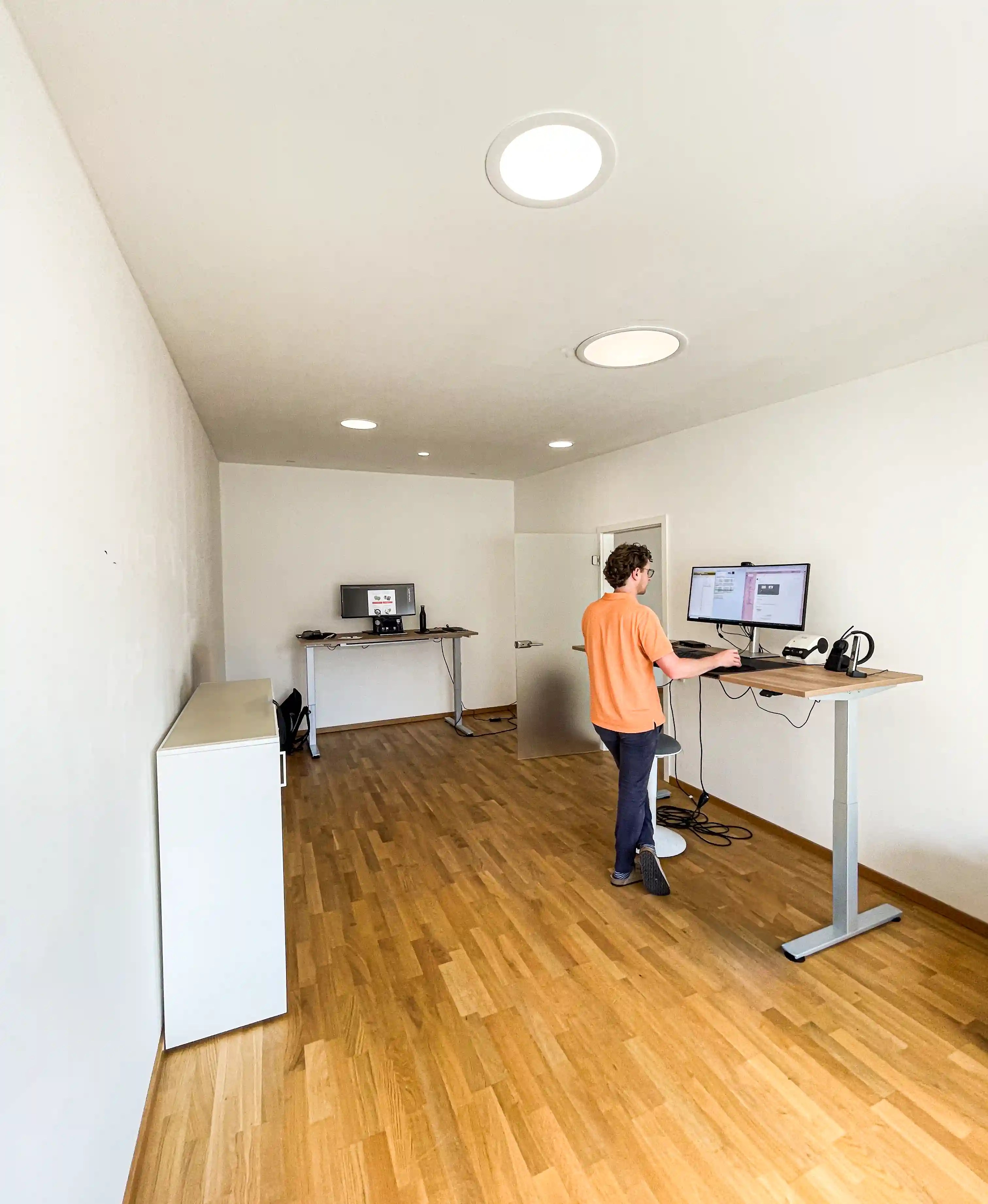 ➔ Anfang des Jahres haben wir unsere neuen Räumlichkeiten bezogen. Das neue Büro in der Max-Stromeyer-Straße ist hell und sehr offen gestaltet. Es bietet einen besonderen Entfaltungsraum für Kreativität und konzentriertes Arbeiten. Neben den Arbeitsräumen gibt es eine geräumige Küche, in der man auch etwas zu Mittag kochen kann. Der Neubar ist trotz der Nähe zur Hauptstraße sehr ruhig. Die Arbeitsplätze sind mit einem Computer, einem Monitor, einer Tastatur und einer Maus ausgestattet. Außerdem sind einige Tische höhenverstellbar, sodass du auch im Stehen arbeiten kannst, wenn du möchtest.